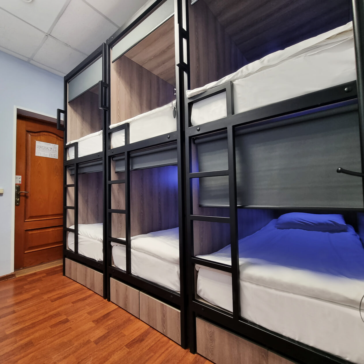 Капсульные кровати оборудованы всем необходимым для комфортного проживания (вентиляция, розетки, ночники, откидной мини столик/полка)